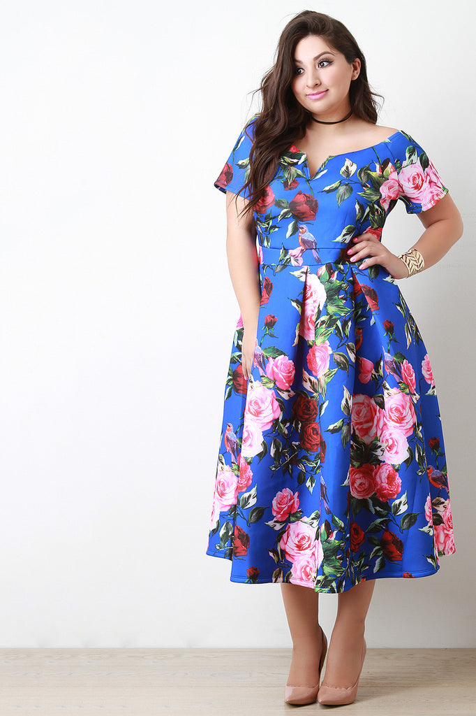 This plus size dress features a neoprene rosette printed fabric, off the shoulder neckline with a v-wire inset, short sleeves, and pleated skirt construction. Finished with a midi-length hemline and rear zipper fastener. Accessories sold separately. 90% Polyester, 10% Spandex.