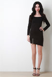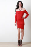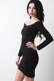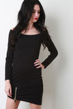 This mini dress features an off-the-shoulder neckline, long sleeves, sculpture fit, and an asymmetrical hemline with a oversize zipper accent. Accessories sold separately. Made in U.S.A. 67% Rayon, 29% Nylon, 4% Spandex.