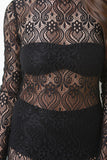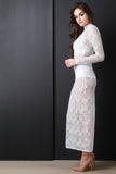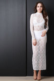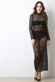 This maxi dress features semi-sheer baroque pattern lace, mock neck, long sleeves, and back cut out with single button closure at nape. Accessories sold separately. Made in U.S.A. 100% Polyester.