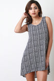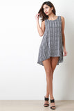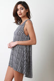 This shift dress features stripe design fabric, round neckline, sleeveless, self-tie lace up back and finished with a high low hemline. Accessories sold separately. Made in U.S.A. 100% Polyester.