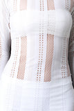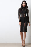 This bodycon dress features a turtle neckline, long sleeves, zipper fastener at back, sculpture fit, and semi-sheer vertical mesh fabrication. Accessories sold separately. Made in U.S.A. 95% Polyester, 5% Spandex.