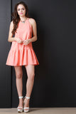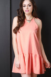 This mini dress features a halter neckline, sleeveless and soft gathered ruffles at the hemline. Finished with a keyhole back with a self-tie design. Accessories sold separately. Made in U.S.A. 100% Polyester.