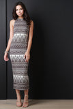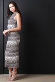 This midi dress features a round neckline, sleeveless design, sculpture fit, and tribal pattern print on ribbed knit fabrication. Accessories sold separately. Made in U.S.A. 51% Rayon, 44% Polyester, 5% Spandex.