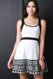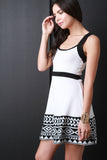 This fit & flare colorblock dress features a scoop neckline, sleeveless construction, tribal print at the hems, and exposed back-zip closure. Finished with contrast panels at neckline, sleeves, and waist. Accessories sold separately. Made in 25% Nylon, 75% Polyester.