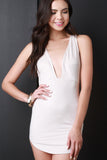This mini dress features a sleeveless construction, a plunging v-neckline, and an elasticized vegan suede fabrication. Finished with a rounded hemline and sculpture fit. Accessories sold separately. Made in U.S.A. 90% Polyester, 10% Spandex.