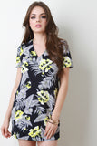 This tropical print fabrication, v-neckline, and short sleeves design. Finished with an exposed zip closure at the back. Accessories sold separately. 95% Polyester, 5% Spandex.