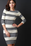 This sweater striped print knit fabrication, long sleeves design, stretchy bodycon fit, and finished with a banded crew-neck. Accessories sold separately. 100% Cotton.