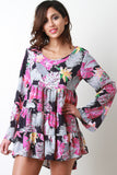 This babydoll dress features a round neckline, open back with corset cage design, long bell sleeves, ruched panel flare seam, and tropical palm pattern print. Accessories sold separately. Made in U.S.A. 100% Polyester.