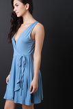 This dress features a surplice v-neckline, smooth stretchy fabrication, wrap inspired design, and sleeveless construction. Finished with a self-tie drawstring at waist. Accessories sold separately. Made in U.S.A. 95% Polyester, 5% Spandex.