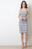 This dress features a stripe pattern design, ribbed knit fabrication, sleeveless construction, scoop neckline and back. Finished with a right slit. Accessories sold separately. Made in U.S.A. 51% Rayon, 44% Polyester, 5% Spandex.
