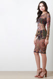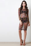 This dress features a vibrant tribal print throughout, semi-sheer mesh fabrication, long sleeves, and round neckline. Finished with a midi lenght hemline, and keyhole back with single button hook closure. Accessories sold separately. Made in U.S.A. 100% Polyester.