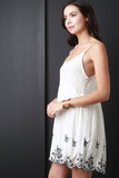 This embroidered dress features a scooped neckline with adjustable spaghetti shoulder straps, open back accent with a horizontal strap, sleeveless design, gather waist, and scalloped hem. Accessories sold separately. Made in U.S.A. 100% Rayon w/ Embroidery. Lining: 100% Polyester.
