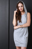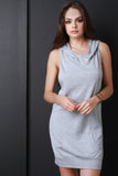 This sleeveless dress features a sweatshirt inspired design, hoodie back to a crisscross design, and a kangaroo pocket front. Accessories sold separately. Made in U.S.A. 95% Polyester, 5% Spandex.