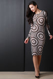 This chic midi dress features a semi-sheer mesh fabrication, target pattern design, round neckline, and longsleeves with mesh panel detail. Finished with a midi-length hemline. Accessories sold separately. Made in U.S.A. 100% Polyester.