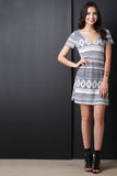 This casual dress features a multi colored tribal inspired stripe pattern, rib knit fabrication, deep V-neckline, deep V back, A-line cut and a tie closure at the nape. Accessories sold separately. Made in U.S.A. 51% Rayon, 44% Polyester, 5% Spandex.