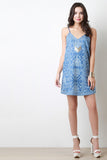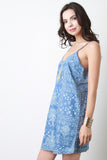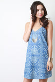 This casual springtime dress features bandana print chambray fabric, deep v-neckline, adjustable spaghetti straps, strappy cage back, and relaxed fit. Accessories sold separately. 80% Cotton, 15% Polyester, 5% Viscose.
