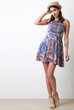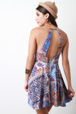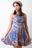 This flirty skater dress features an open back design, round halter neckline, button closure at nape, exposed zipper back closure, finished with a full circle skirt. Accessories sold separately. 100% Rayon.