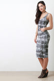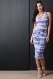 This midi dress features tie dye jersey knit, scoop neckline, front pouch, and open back. Accessories sold separately. Made in U.S.A. 44% Polyester, 29% Cotton, 27% Rayon.