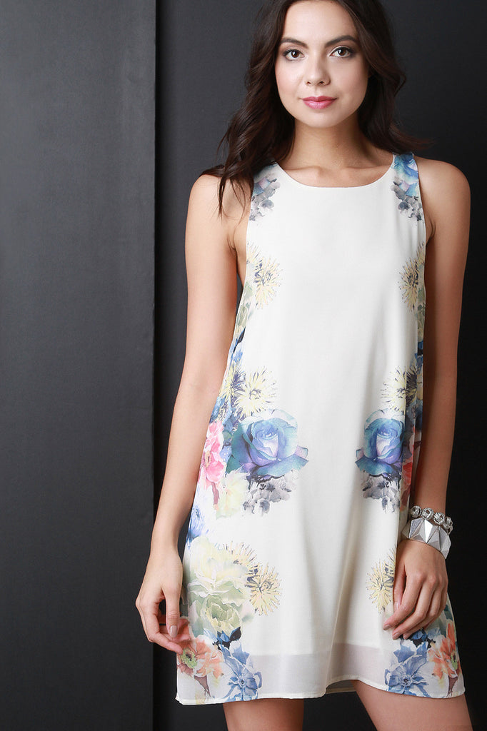 This gorgeous shift dress features a engineered floral print chiffon fabrication, rounded neckline, back keyhole, button closure at nape and relaxed fit. Fully lined. Accessories sold separately. 100% Polyester. Lining: 100% Polyester.