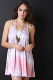 This dress features a tie dye print on a jersey knit fabrication, spaghetti straps to a crisscross back detail, deep v-neckline, and mini-length hemline. Accessories sold separately. Made in U.S.A. 96% Rayon, 4% Spandex.