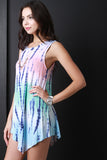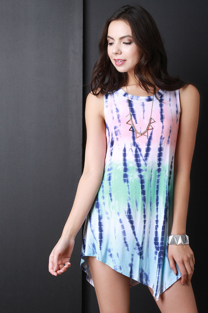 This dress features a jersey knit fabrication, tie dye print, mock neckline, sleeveless fit, and asymmetrical mini-length hemline. Accessories sold separately. Made in U.S.A. 96% Rayon, 4% Spandex.