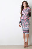 This funky dress features a soft knit fabrication with contrasting long mesh sleeves, diamond geometrical pattern print, round neckline, and midi-length hemline. Accessories sold separately. Made in U.S.A. 92% Polyester, 8% Spandex.