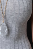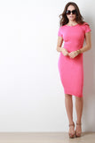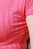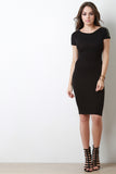 This dress features a ribbed knit fabrication, asymmetrical zippered lip neckline to shoulder, and short sleeves construction. Finished with a midi-length hemline. Accessories sold separately. Made in U.S.A. 95% Rayon, 5% Spandex.
