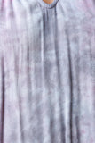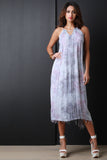 This dress features a halter style neckline, front and back key hole, self tie straps, loose flowy fit, finished with a raw frayed asymmetrical hemline. Accessories sold separately. Made in U.S.A. 100% Rayon.
