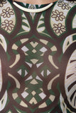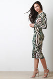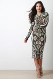 This midi dress features a semi-sheer mesh fabrication, abstract daisies tribal print, round neckline, and long sleeves construction. Accessories sold separately. Made in U.S.A. 100% Polyester.