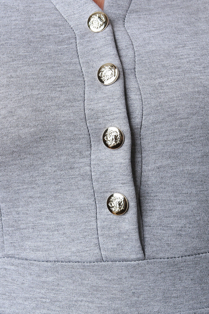 This maxi dress features a jersey knit fabrication, v-neckline, button up design with gold buttons accent, faux two front buttoned pockets, and elbow length sleeves. Accessories sold separately. Made in U.S.A. 87% Polyester, 10% Rayon, 3% Spandex.