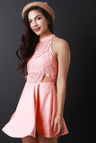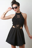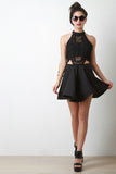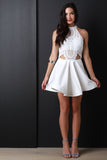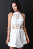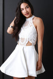 This flirty skater dress features a mock neck line, single button closure at nape, crochet lace cut out top, open back, adjustable back straps, stiff horse hair hemline, circle skirt, finished with an exposed metal zipper. Accessories sold separately.Self: 95% Polyester, 5%Spandex. Contrast/Lining 100% Polyester.