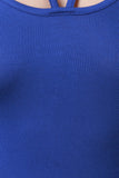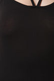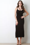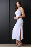 This maxi dress features soft jersey knit, strappy neck and back, sleeveless design, and two side slits. Accessories sold separately. Made in U.S.A. 96% Rayon, 4% Spandex.