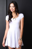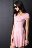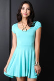 This casual dress features a jersey knit fabrication, scoop neckline, cap sleeves construction, and flowy flare skirt. Finished with an elasticized cinched waist. Accessories sold separately. Made in U.S.A. 94% Rayon, 6% Spandex.