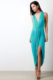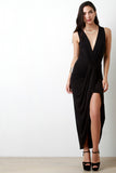This simply chic dress features a jersey knit fabrication, surplice wrap v-neckline, gathered center detail with slit, and sleeveless construction. Finished with an underskirt and rounded hemline. 94% Rayon, 6% Spandex.