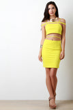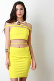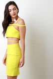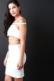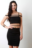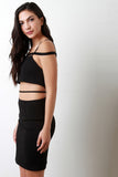 This sexy bodycon dress features a stretchy knit fabrication, tube top, thin shoulder straps with a strap going across, and open mid-section with a strap detail. Finished with a rear zip-up closure, and mini-length hemline. Accessories sold separately. 96% Polyester, 4% Spandex.
