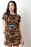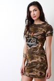 This shirt dress features a jersey knit fabrication, camouflage print throughout with an eagle 778 detail patch at front and at one sleeve, round neckline and short sleeves fit. Finished with a mini-length hemline. Accessories sold separately. 90% Cotton, 10% Cotton.