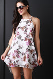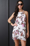 This adorable shift dress features a woven chiffon fabrication, floral rose print, spaghetti straps, back keyhole with button at nape, fully lined, with a rounded high low hemline. Accessories sold separately. Made in U.S.A. 100% Polyester.