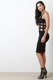 This sexy bodycon dress features a cage style open bodice, and a soft knit fabric skirt, curve hugging fit and a knee length hemline. Accessories sold separately. Shell: 95% Rayon 5% Spandex. Contrast: 100% Polyester.