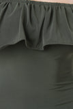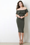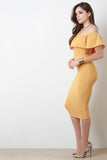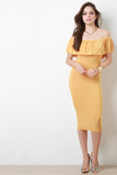 This charming dress features a smooth stretchy fabric, elasticized off-the-shoulder ruffled neckline, and midi-length hem. Accessories sold separately. Made in USA. 94% Polyester, 6% Spandex.