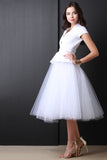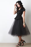 This chic dress features a v-neckline, neoprene fabricated top, and a full tulle skirt, faux button up top, peplum detail, and a midi length skirt. Accessories sold separately. Made in U.S.A. 95% Polyester 5% Spandex.