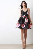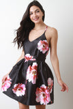 This taffeta skater dress features floral print, deep v-neckline, spaghetti straps that criss-cross at back, pleated waist, and hidden back zipper closure. Accessories sold separately. 100% Polyester.