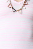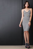 This sleeveless dress features soft stretch knit, horizontal stripes, deep v-neckline, criss-cross and cut out back, and midi length. Accessories sold separately. Made in USA. 95% Polyester, 5% Spandex.