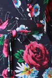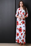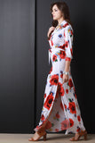 This gorgeous dress features a colorful floral print throughout, surplice v-neckline, attached self-tie waist sash, three quarter sleeves with gather detail, and maxi-length hemline with a single thigh high slit. Accessories sold separately. Made in U.S.A. 95% Polyester, 5% Spandex.