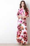 This gorgeous dress features a colorful floral print throughout, surplice v-neckline, attached self-tie waist sash, three quarter sleeves with gather detail, and maxi-length hemline with a single thigh high slit. Accessories sold separately. Made in U.S.A. 95% Polyester, 5% Spandex.