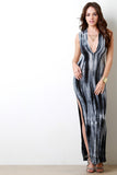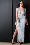 This maxi dress features a jersey knit fabrication, tie dye print design, plunging v-neckline, and crisscross back detail. Finished with a one side high slit. Accessories sold separately. Made in U.S.A. 96% Rayon, 4% Spandex.