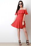 This strapless dress features a thermal knit fabrication, off the shoulder elastic neckline, large single ruffle detail, fitted bodice and a full circle skirt. Accessories sold separately. Made in U.S.A. 94% Cotton, 6% Spandex.