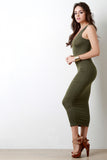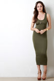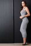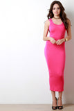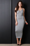 This simple dress features a jersey knit fabrication, scoop neckline and back, sleeveless fit, and finished with a maxi-length hemline. Accessories sold separately. Made in U.S.A. 95% Rayon, 5% Spandex.