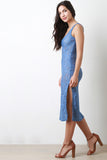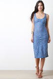 This midi dress features a knit fabrication with a burn out lace design, scoop neckline, sleeveless design, low cut back, double side slits, and a curve hugging fit. Accessories sold separately. Made in U.S.A. 82% Polyester, 18% Nylon.
