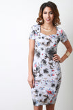 This bodycon dress features floral print, sweetheart neckline, short sleeves, back zipper closure, and slit. Accessories sold separately. 95% Polyester, 5% Spandex.