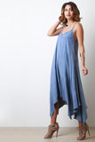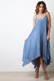 This casual dress features spaghetti straps , a v neckline, woven fabrication, v shaped back, loose flare cut silhouette, and a handkerchief midi length hem. Accessories sold separately. Made in U.S.A. 100% Viscose.